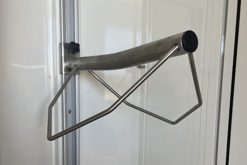 Barre de fixation rétractable installée à l'arrière du véhicule pour attacher les chevaux en toute sécurité.